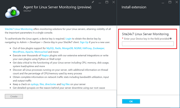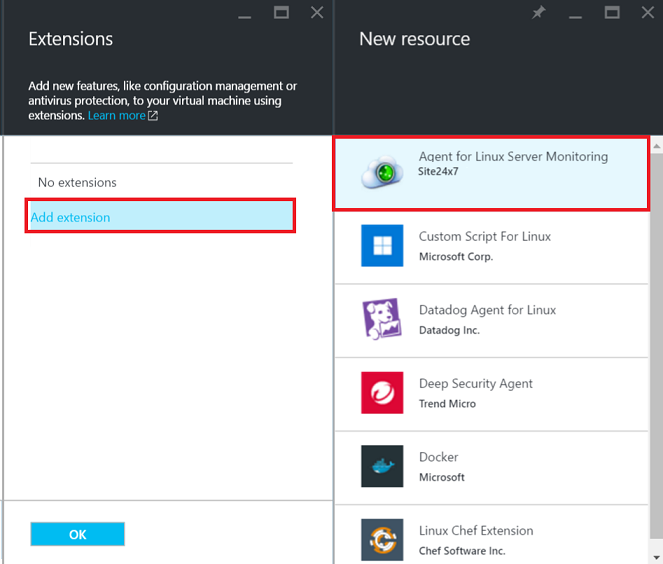 - Under Settings blade, go to Extensions > Add Extension (+) > Server Monitoring for Windows/Linux - Site24x7