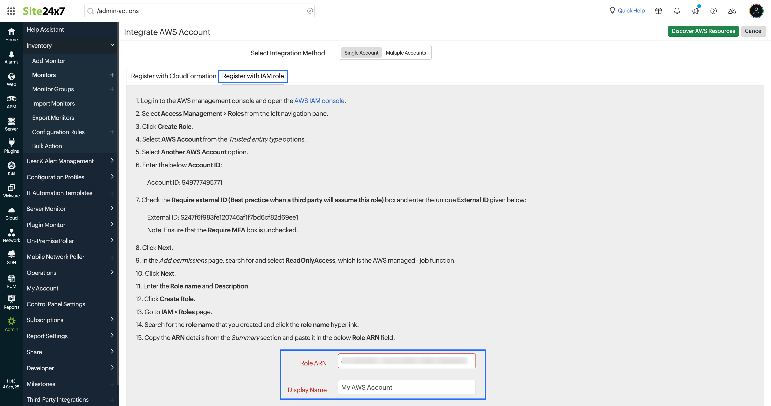 You can either create a cross-account IAM role between your account and Site24x7's AWS account (or) create Site24x7 as an IAM user (authentication by security credentials). Once you are done, log into the Site24x7 console paste the Role ARN (or) security credentials in the Integrate AWS Account form to enable the AWS integration.