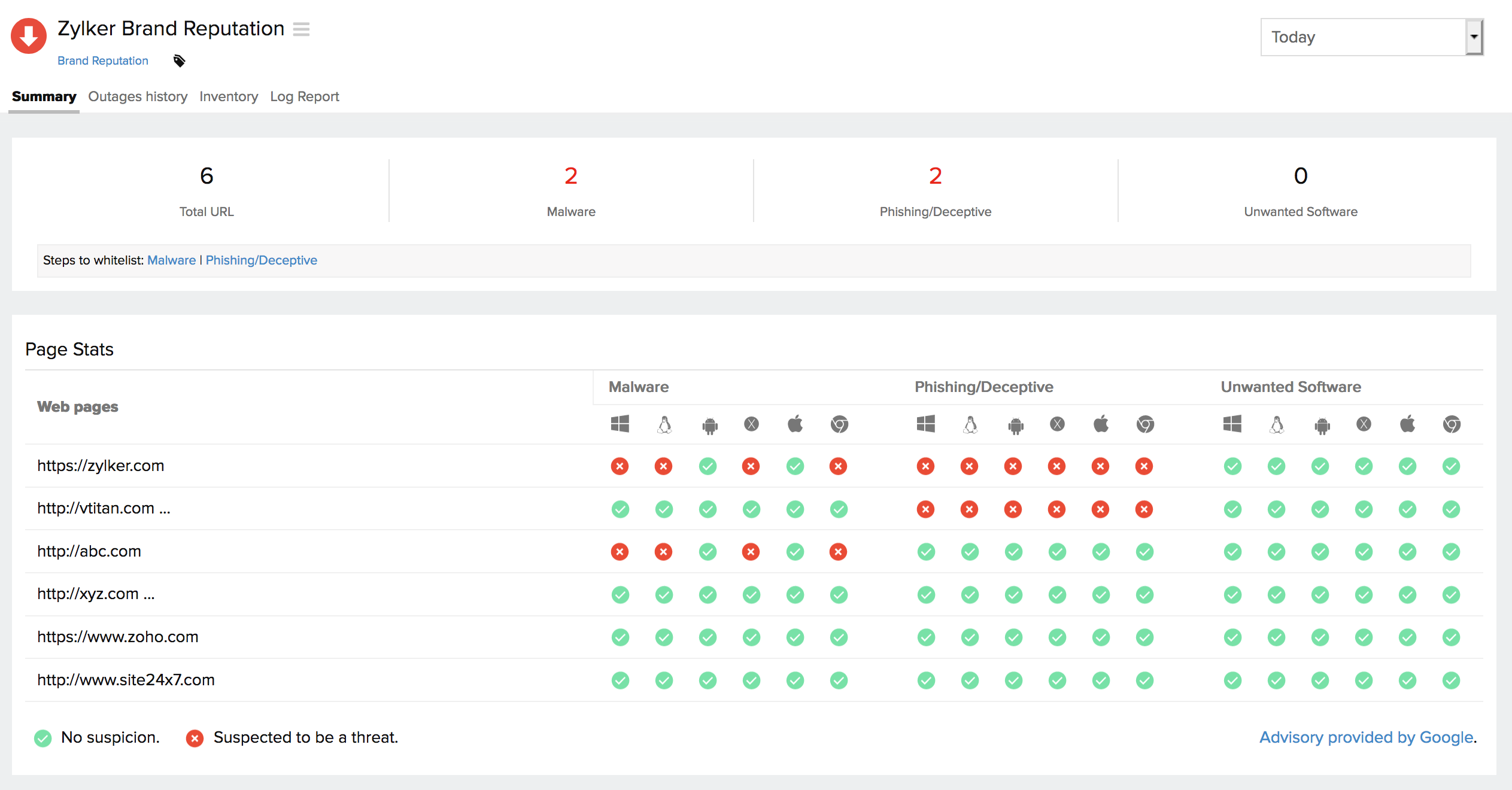 Web Risk list is a repository maintained by Google that comprises a list of URLs perceived to contain malicious code, i.e, malware, untrusted software and social engineering tactics, such as phishing and other forms of deception. Site24x7's Brand Reputation monitor checks your website against regularly updated Web Risk list and notifies you if your website is affected. Since any website containing malware or suspicious for phising activity is seen as a threat to the online community and is often penalized by search engines, any insight from this monitoring will let you steer away from any such malicious code in your site to keep your brand reputation intact. The Monitor allows you to add unlimited URLs for Brand Reputation check. However, 10 URLs in a Brand Reputation monitor will consume one basic monitor license. Additional basic monitor license will be utilized for more than 10 URLs. The default check frequency is set as one hour.