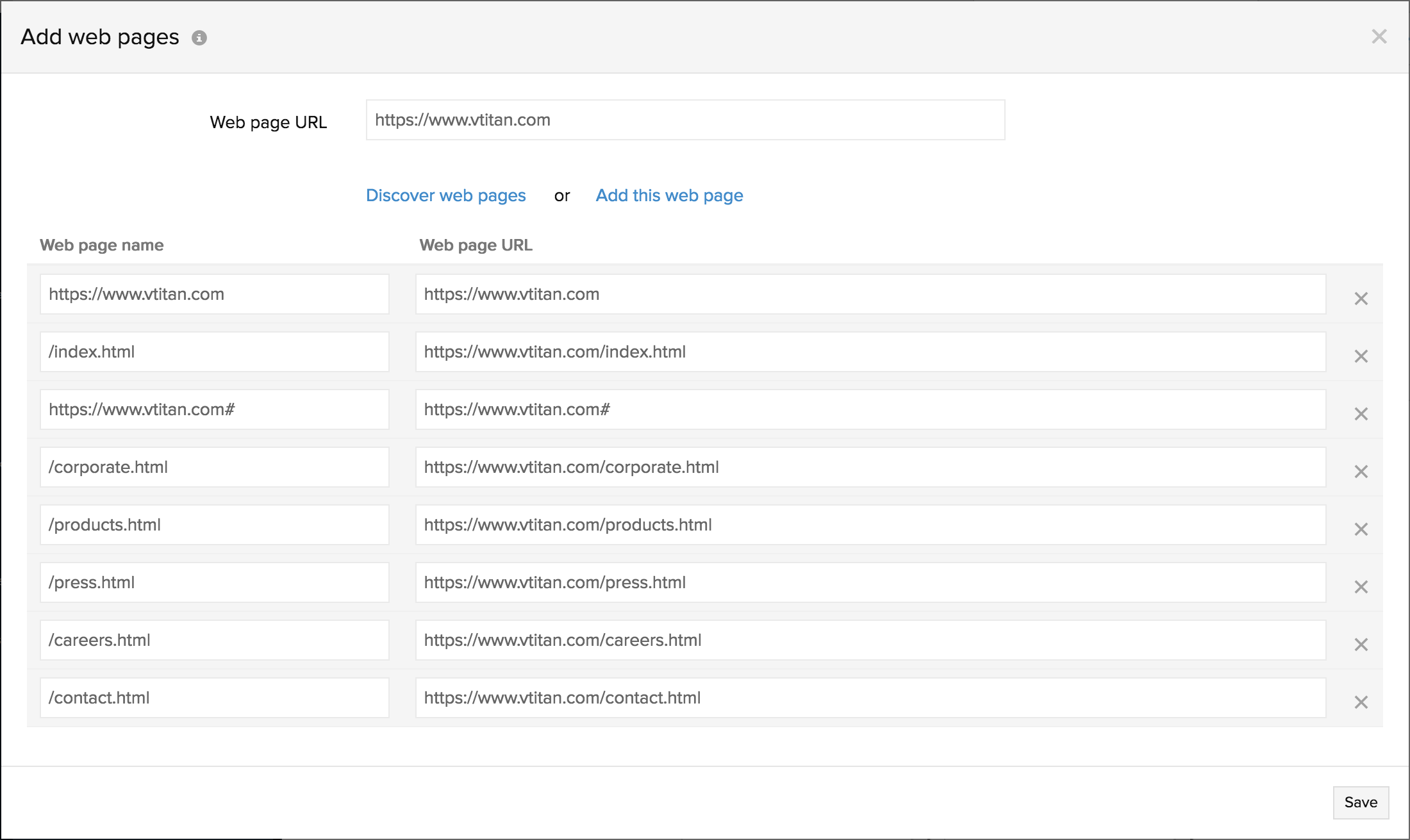- Add Web pages: Specify multiple domain names and respective web page URLs for which brand reputation check has to be done. You can either manually add unlimited URLs to the list or automatically fetch the URLs list using the wizard.