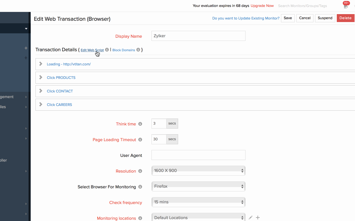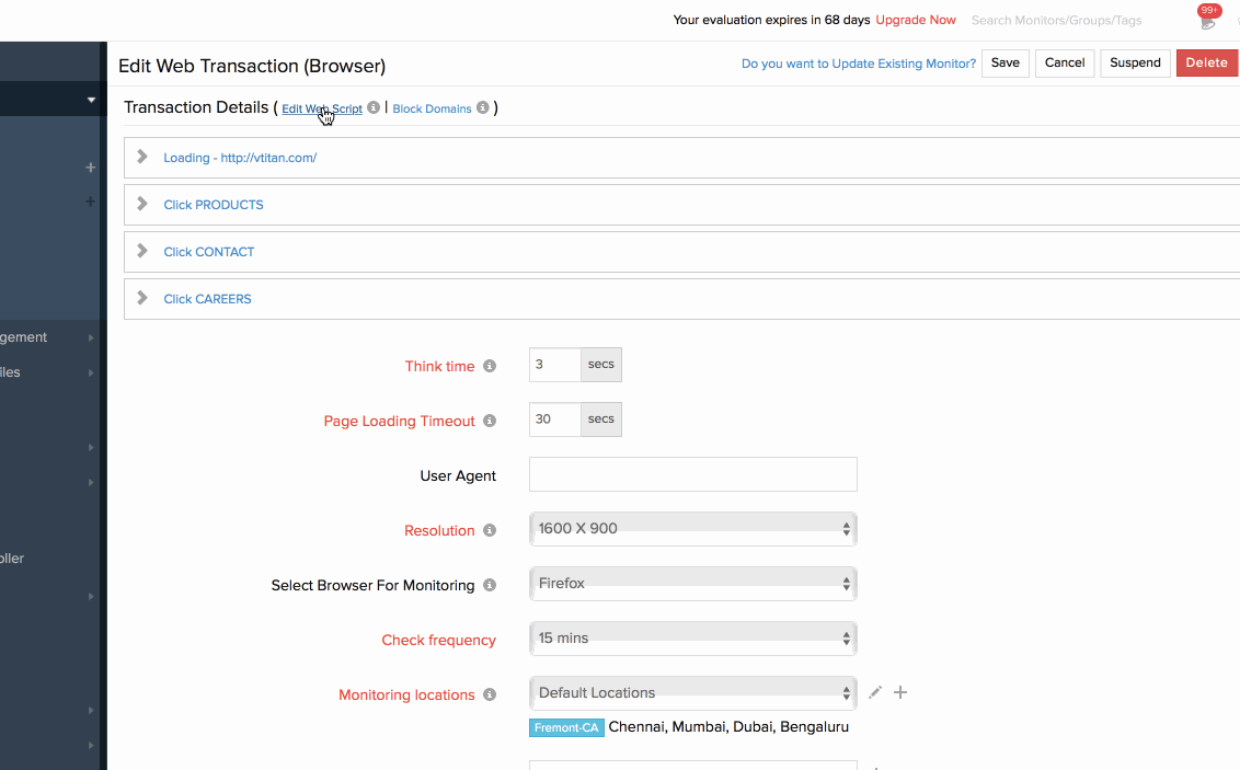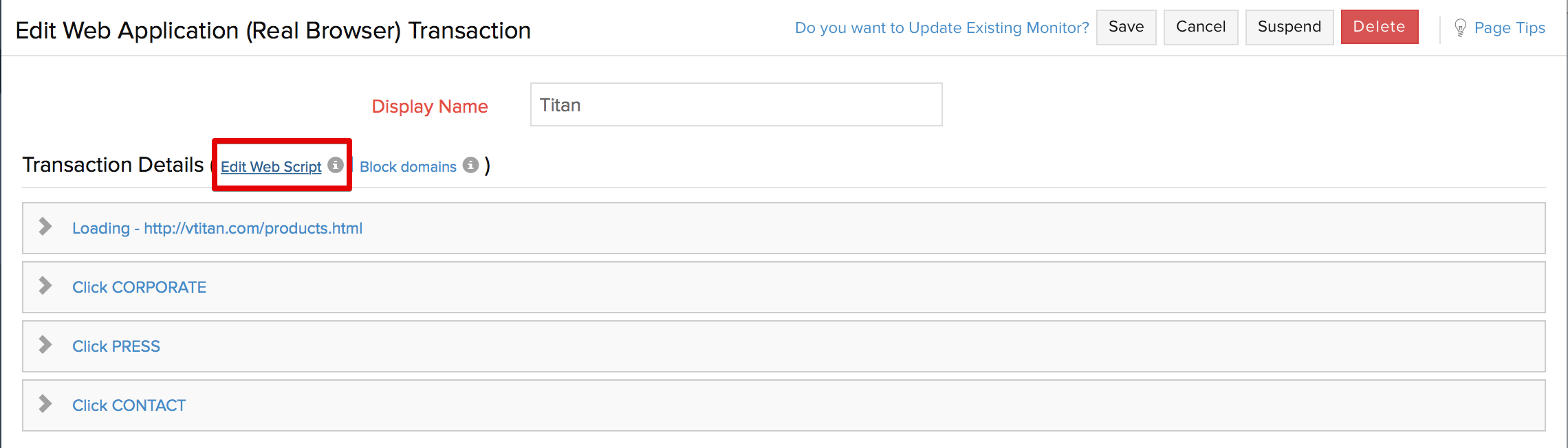 - If you have chosen to modify the step details of the Web Transaction (Browser) monitor, click the Edit Web Script link and update the script in the Web Script Editor.