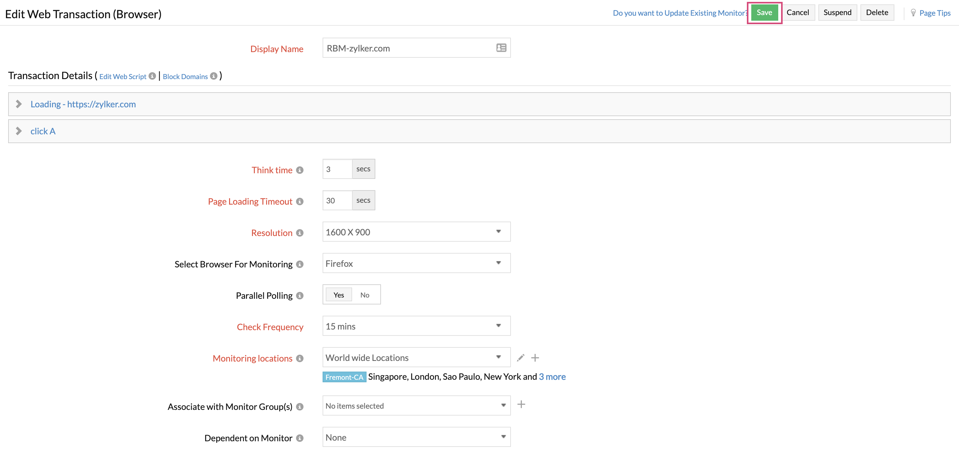 - Once the web script is saved, you can make necessary Configuration and Threshold changes if needed. Click the Save button to create a Clone of the Web Transaction (Browser) Monitor.