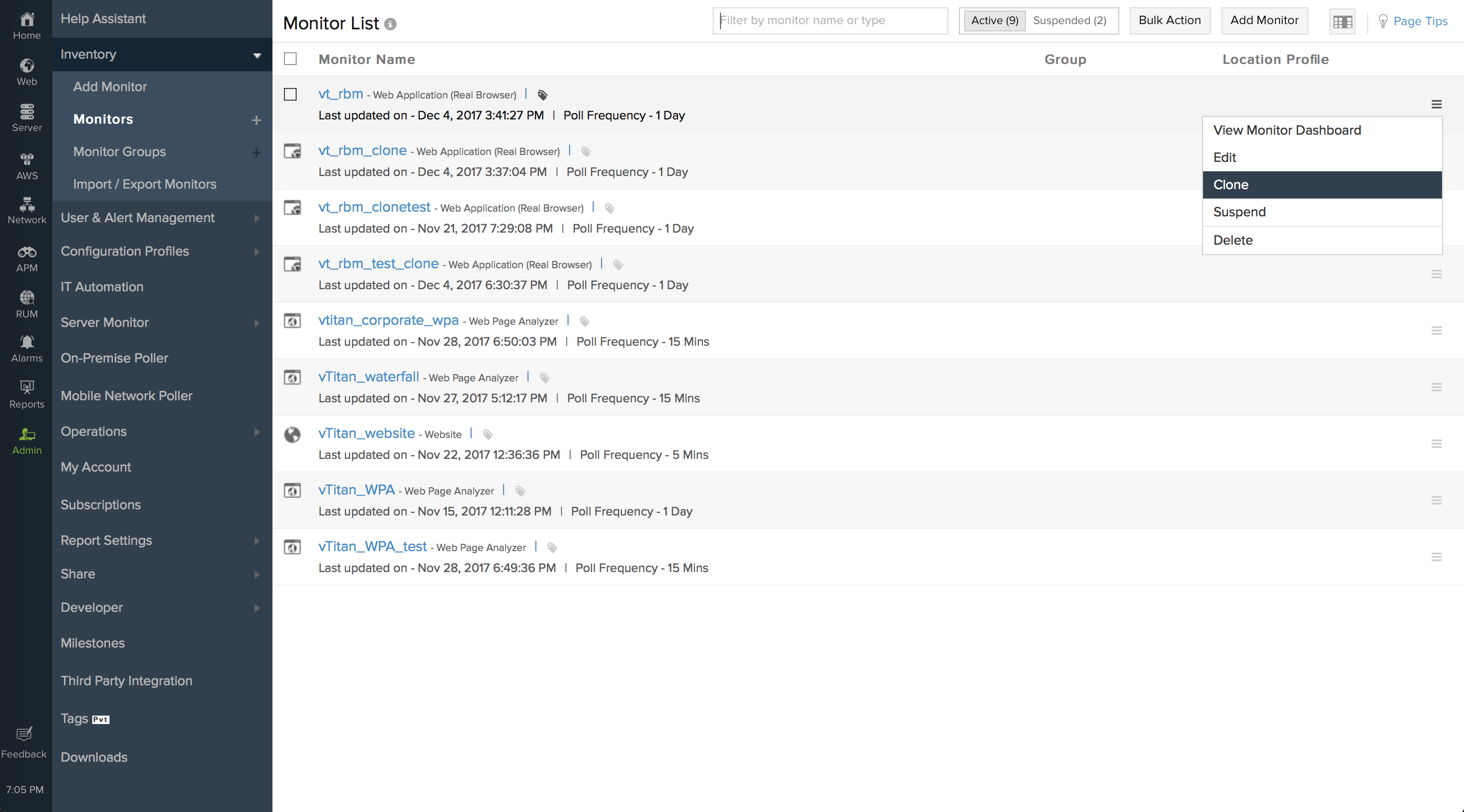 - Select the Web Transaction (Browser) Monitor that you wish to clone from the Monitor List. Now, hover over the