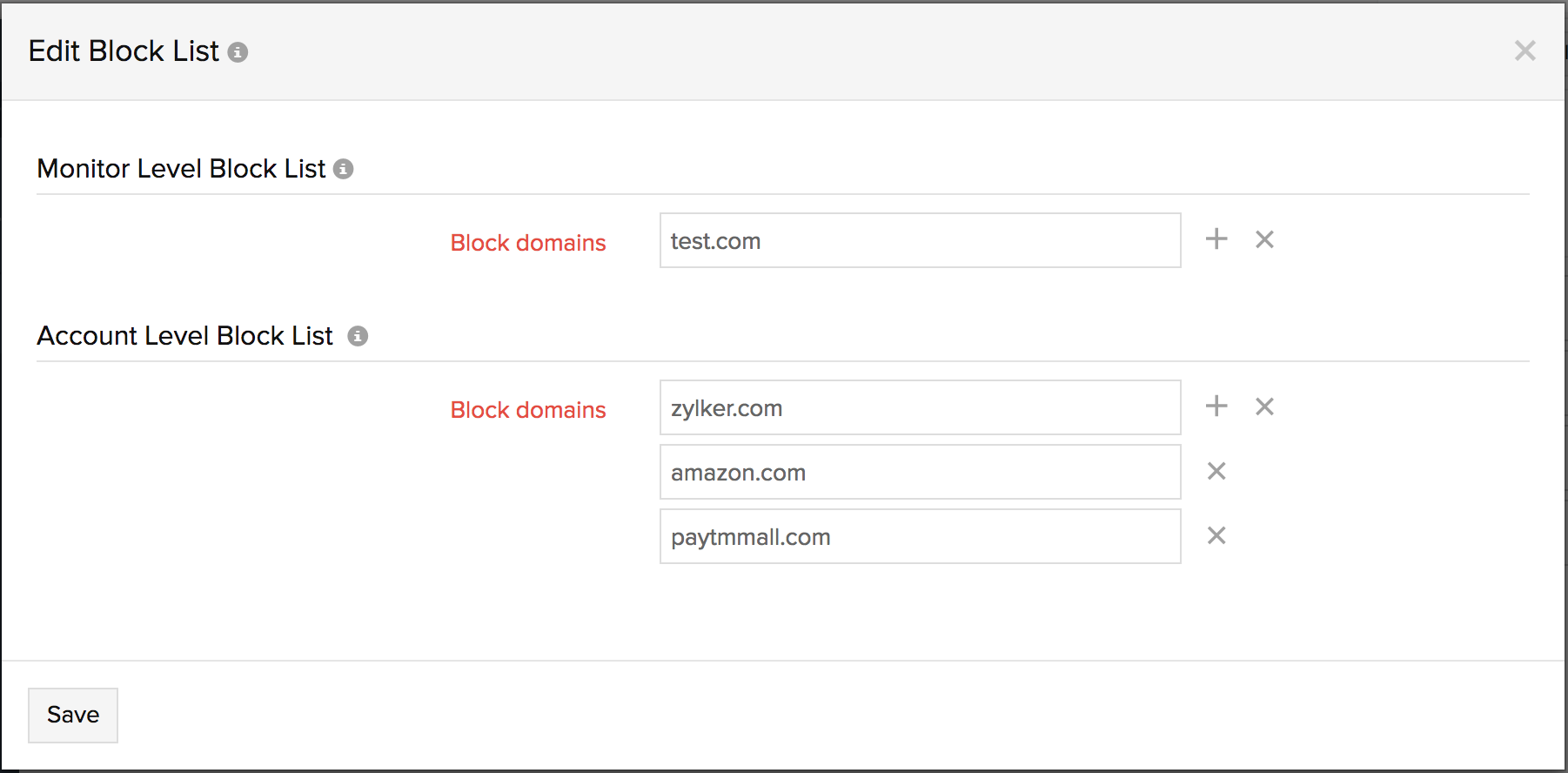 NoteYou can also build a block domain list to restrict monitoring of these domains. Click the Block domains link. When you click the link, you'll be prompted with a pop up window, where you'd be asked to add the domain(s) at the Monitor level or Account level.