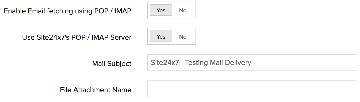 - Mail Subject: Specify the subject field for fetching the mail. The mail subject by default will be "Site24x7-Testing Mail Server".