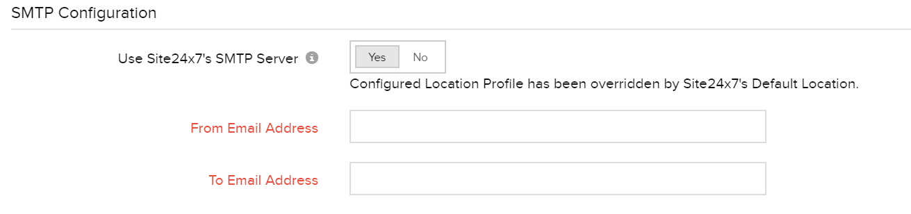 Use Site24x7's SMTP Server: Move the toggle button to Yes to select Site24x7's SMTP Server for testing email delivery. When you opt to use Site24x7 SMTP Server, the configured location profile will be overridden and Site24x7 default location will be used. Once selected, you'll be asked to enter the following fields: