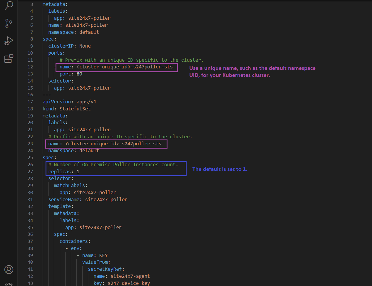 - Provide a replica value (replicas: 1) for the number of On-Premise Pollers instances required. The default is set to one.
