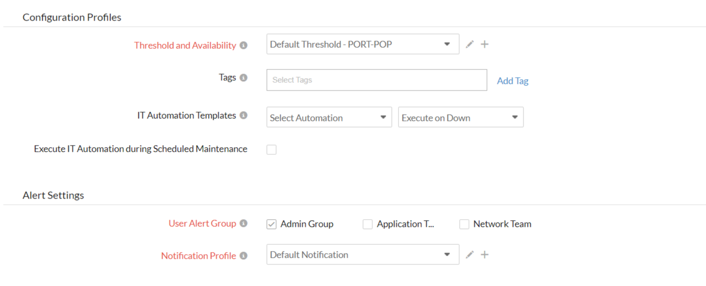- Notification Profile: Choose a notification profile from the drop down or select the default profile available. Notification profile helps to configure when and who needs to be notified in case of downtime. Refer Notification Profile to create a customized notification profile.