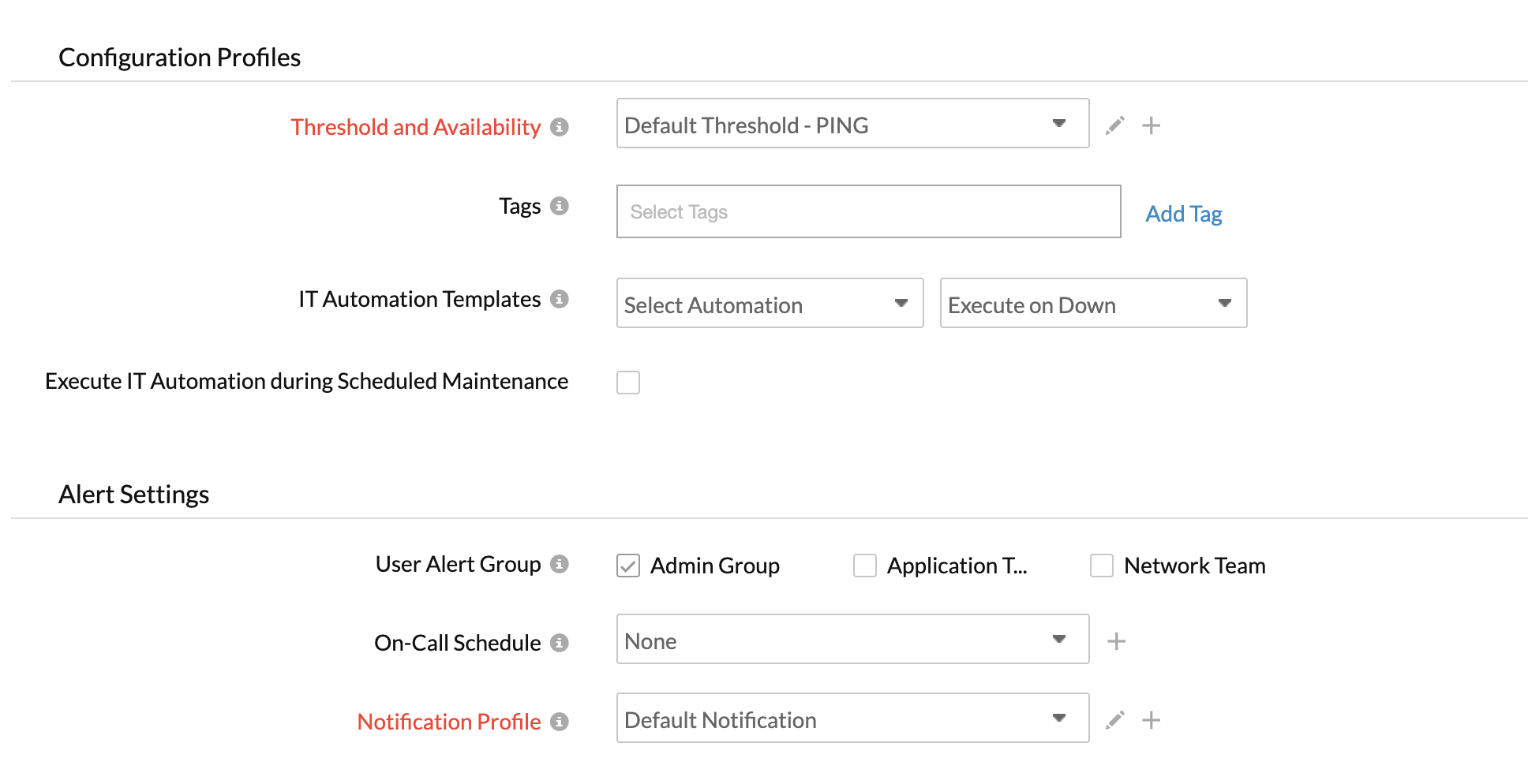 - Notification Profile: Choose a notification profile from the drop down or select the default profile available. Notification profile helps to configure when and who needs to be alerted in case of downtime. Refer Notification Profile to create a customized notification profile.