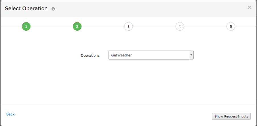 - Operations: Choose the required Operation from the drop down and click Show Request Inputs.