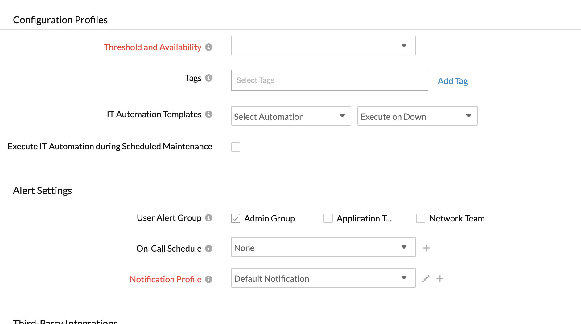 - Threshold and Availability: Select a threshold profile from the drop down list or choose the default threshold set available and get notified when the resources cross the configured threshold and availability.