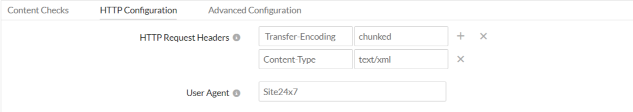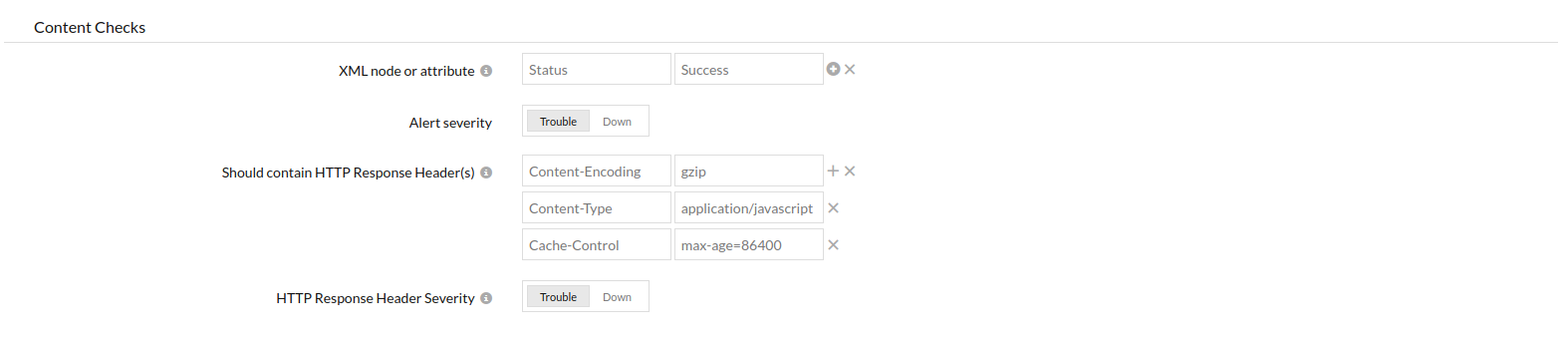 - Should contain HTTP Response Header(s): Enter the desired response header and values for your HTTP request and verify whether the HTTP headers are present or the values match with the desired response. Trigger a trouble or down alert during a check failure.