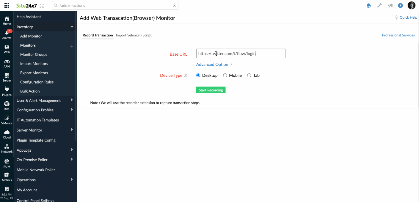 2. Select Site24x7 Web Transaction (Browser) Recorder from the list of options.