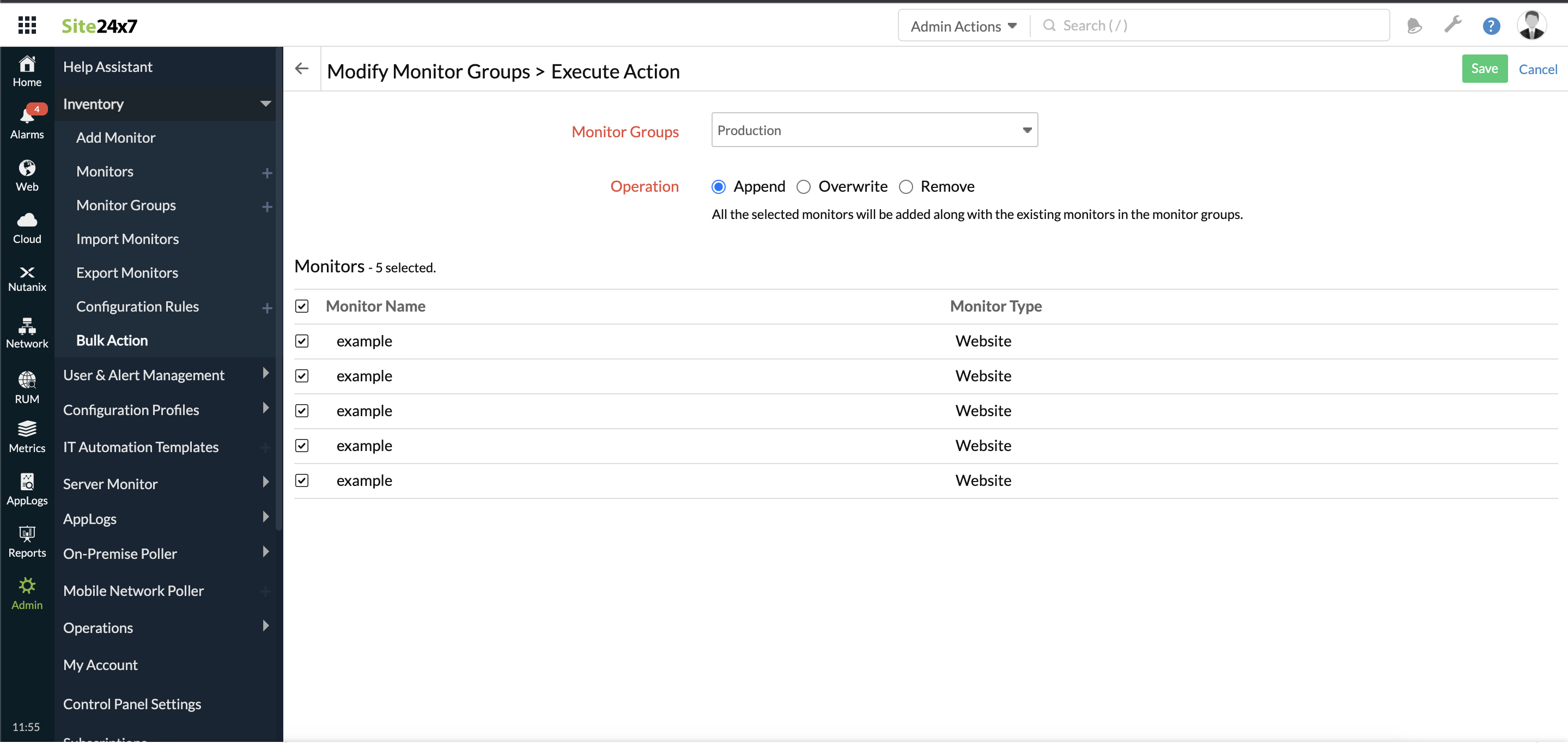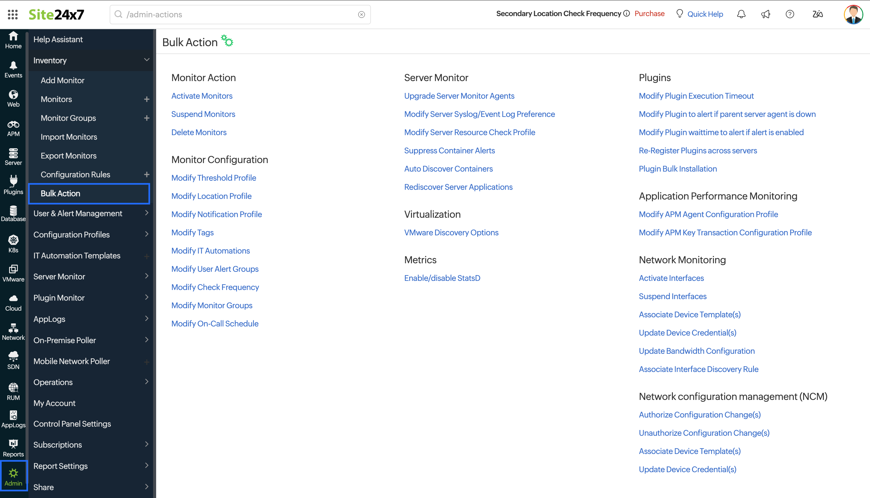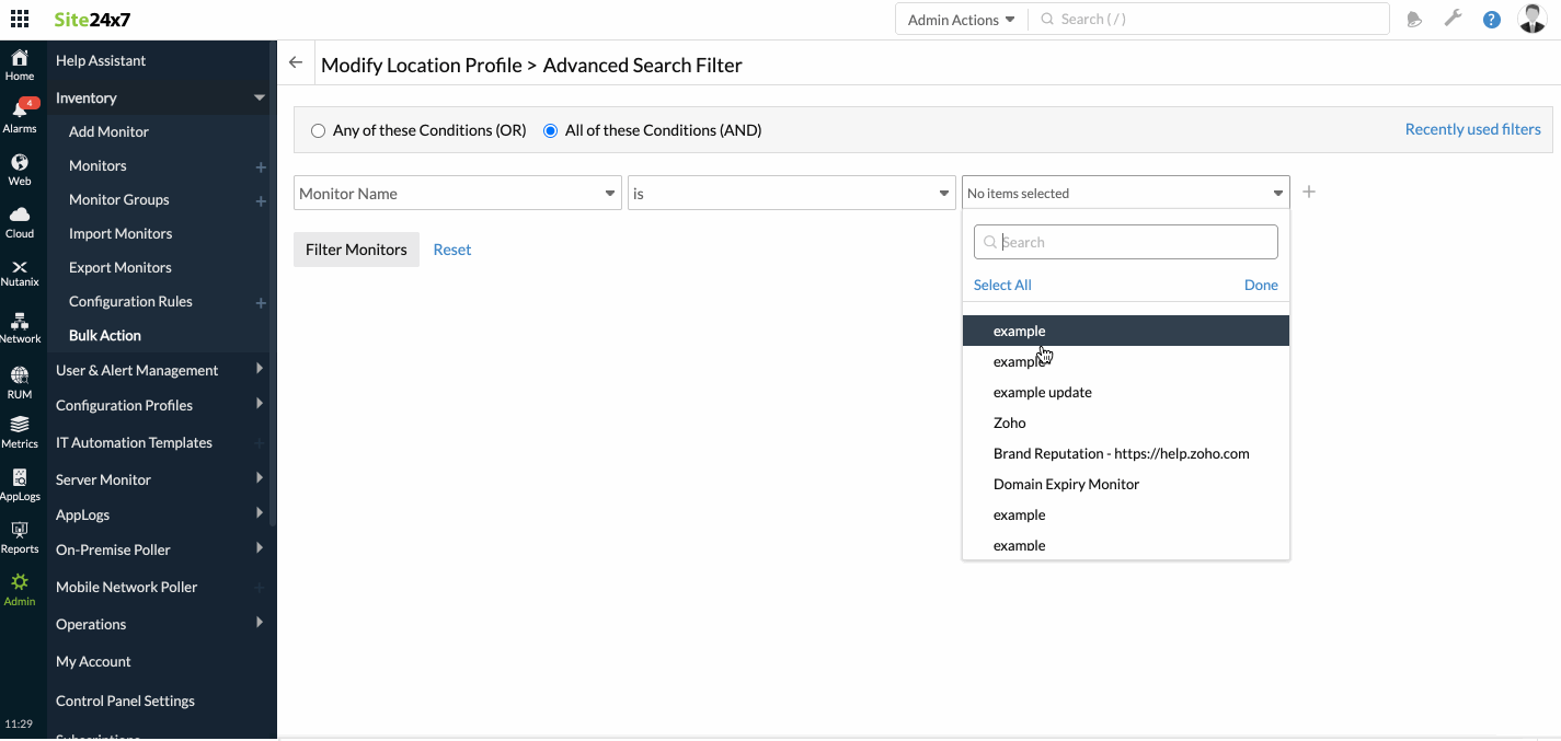 Site24x7 Bulk actions use built-in advanced search filters to identify monitors. You can then execute your required admin action on the selected monitors. Site24x7 allows you to perform all the bulk actions listed in the image below.