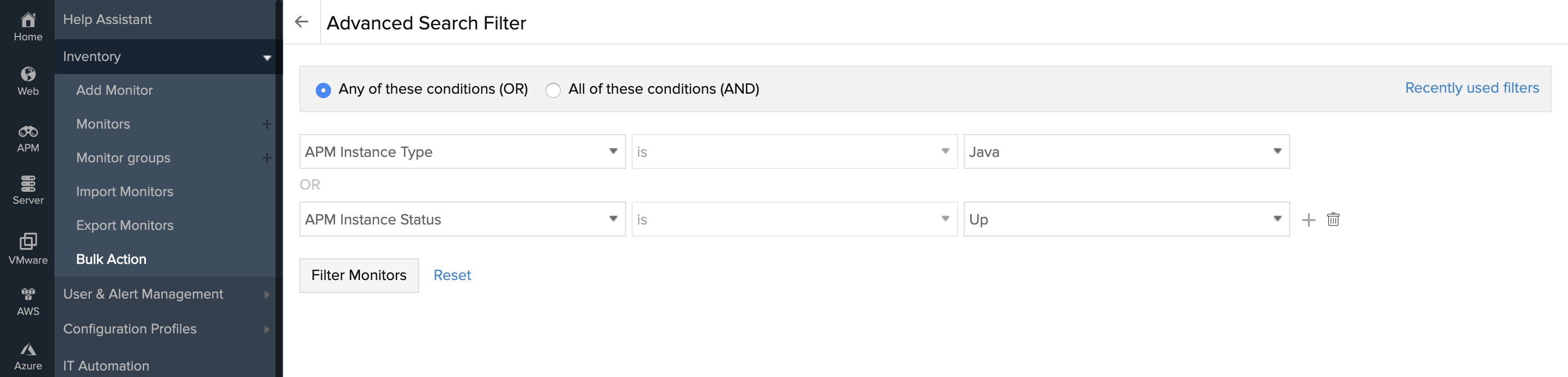 - You'll be directed to the Advanced Search Filter window. The search fields are like any other advanced custom fields—allowing you to create unlimited monitor search expressions. The search filter comes pre-selected with the All of these conditions (AND). With this selection, monitors will be filtered and listed when all the defined conditions are met. You can also use the radio button to choose the Any of these conditions (OR). With this selection though, monitors will be filtered when any of the defined conditions are met.