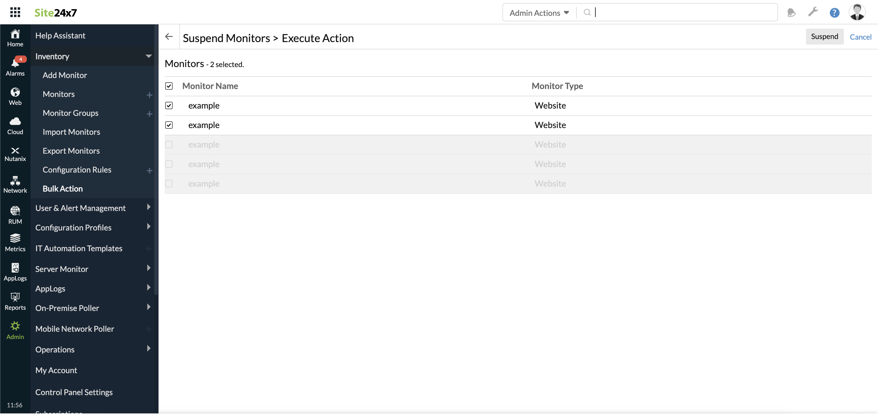 In case of APM monitors, you can add, suspend, or delete in bulk based on instance type or instance status.