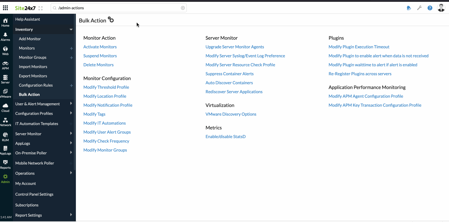 Bulk Action in Site24x7 helps you identify and select multiple monitors in a search and assign them to a particular admin action, such as monitor activation, deletion, suspension, modification of threshold groups, user alert groups, location profiles, or even actions like adding tags to sort monitors into a smarter view. It gives you the ability to perform bulk monitor actions seamlessly inside the web client, without using the APIs.
