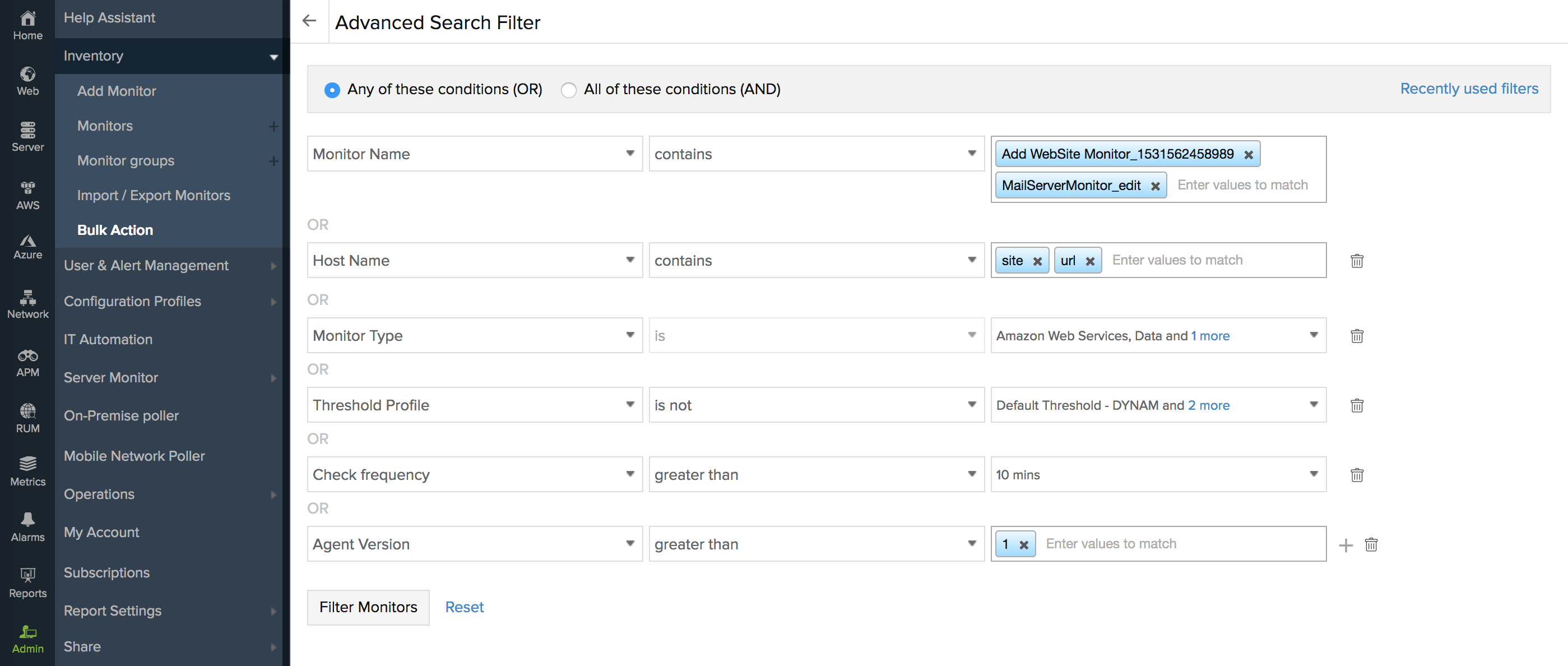 While defining a search expression, you can add multiple values and press enter to define the criteria. Each value defined in the value field will be considered as an OR condition. For example—in the image below, the first search expression value has two separate values specified "Add Website Monitor_1532562458989" and "MailServerMonitor_edit". During the filteration, the OR condition will be implemented, meaning only monitors concuring to any of these conditions will be displayed.