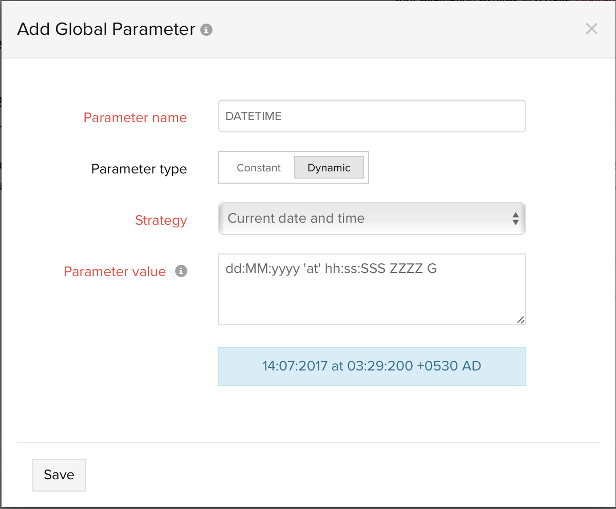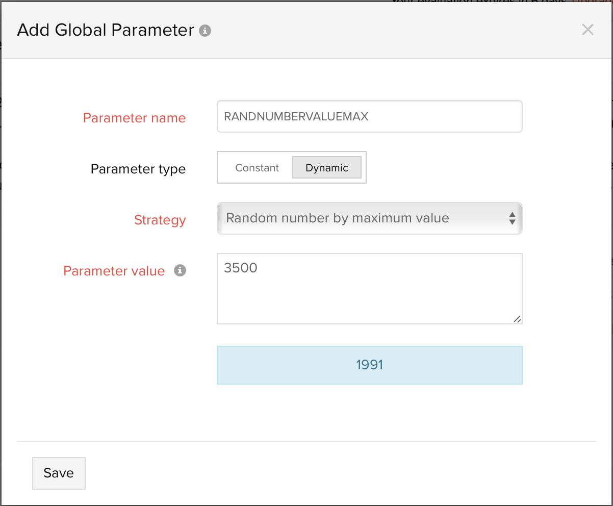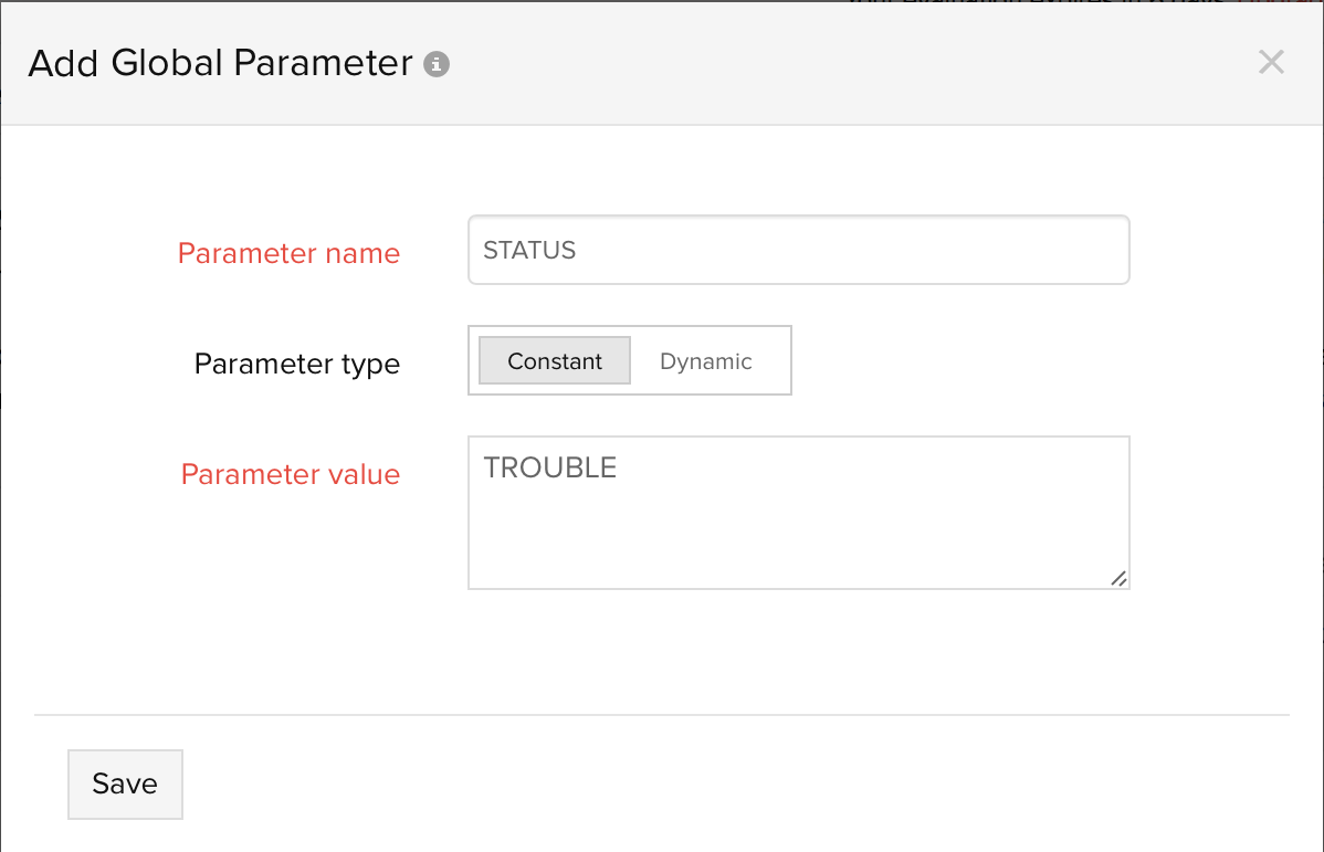 - Once a constant or dynamic parameter has been defined, click the Save button to generate your Global Parameter.