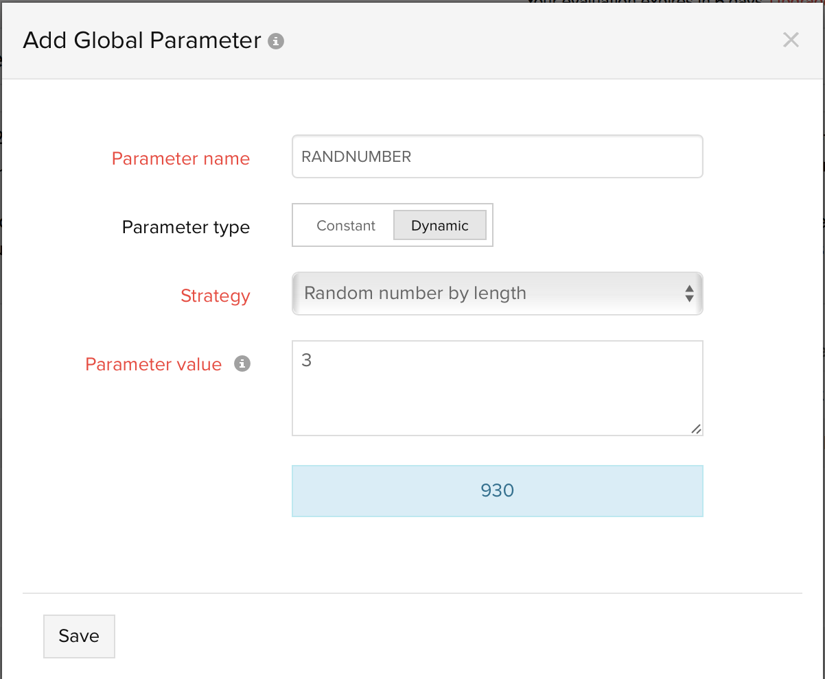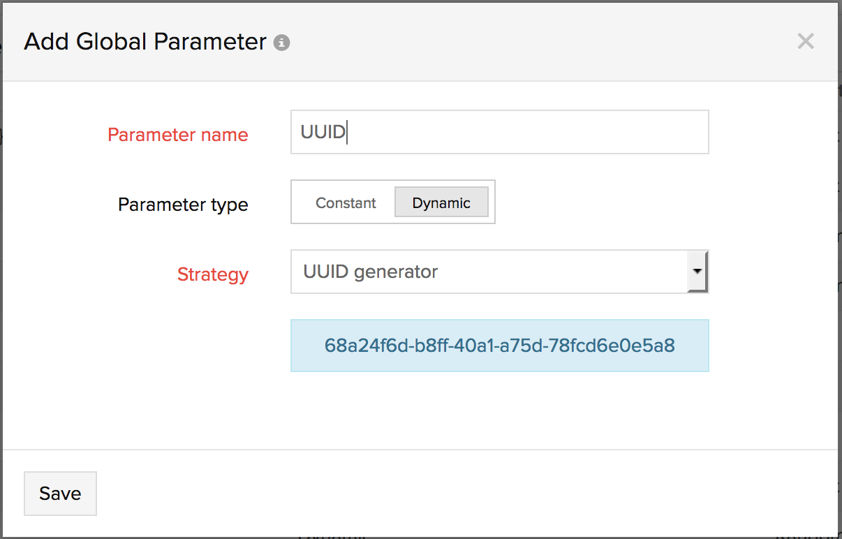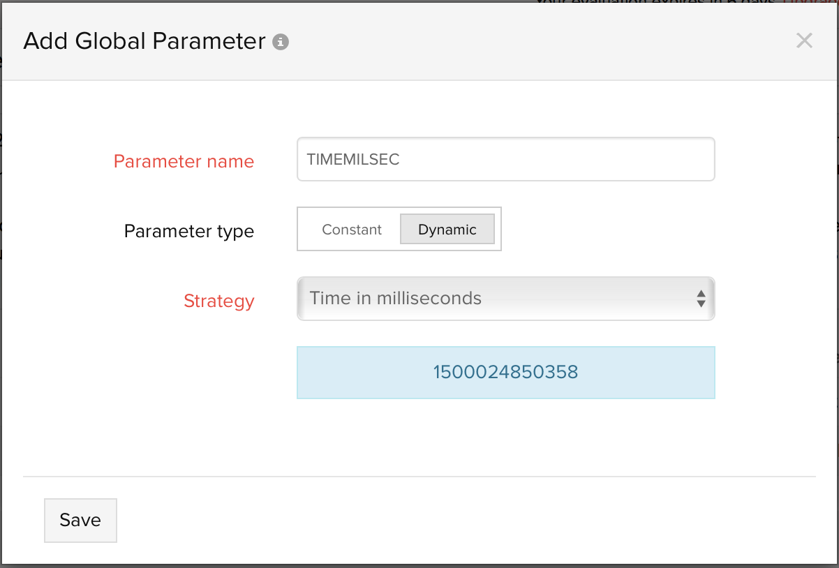 - Once a constant or dynamic parameter has been defined, click the Save button to generate your Global Parameter.