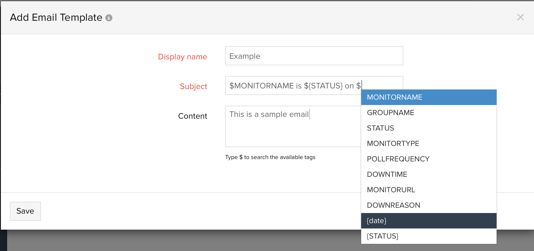 Insert the $ symbol in the Subject or Content field of the Email template to invoke the global parameters. The global parameters will be listed along with the standard parameters. It'll defined as {PARAMETERNAME}. Once the email notification is triggered to the related users, the global parameter names will be substituted by the constant or dynamic values.