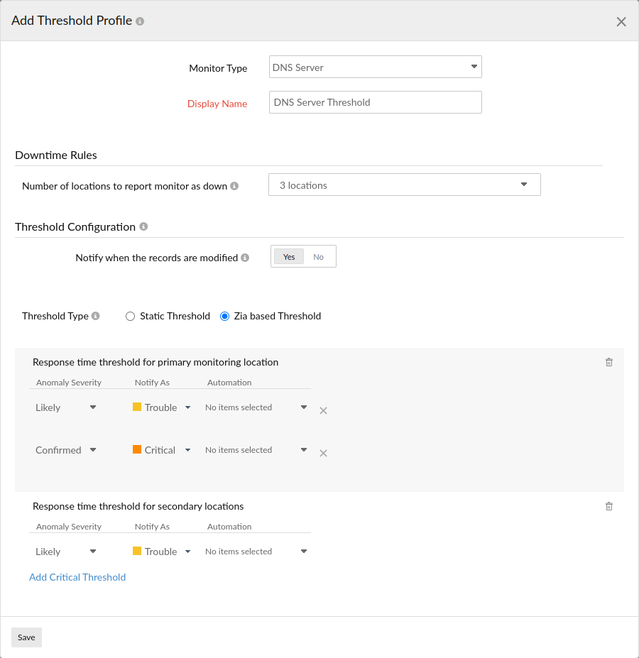 The Zia-based threshold will track the abnormal spikes using anomaly detection and will offer a dynamic threshold which will be updated accordingly. If you're choosing Zia-based threshold, choose associated anomaly severity and the status accordingly.- Response time threshold for primary monitoring location: Choose the anomaly severity, associated severity status and IT automation to be applied and get notified in case if trouble or critical status, if the response time from the primary location has an anomaly.