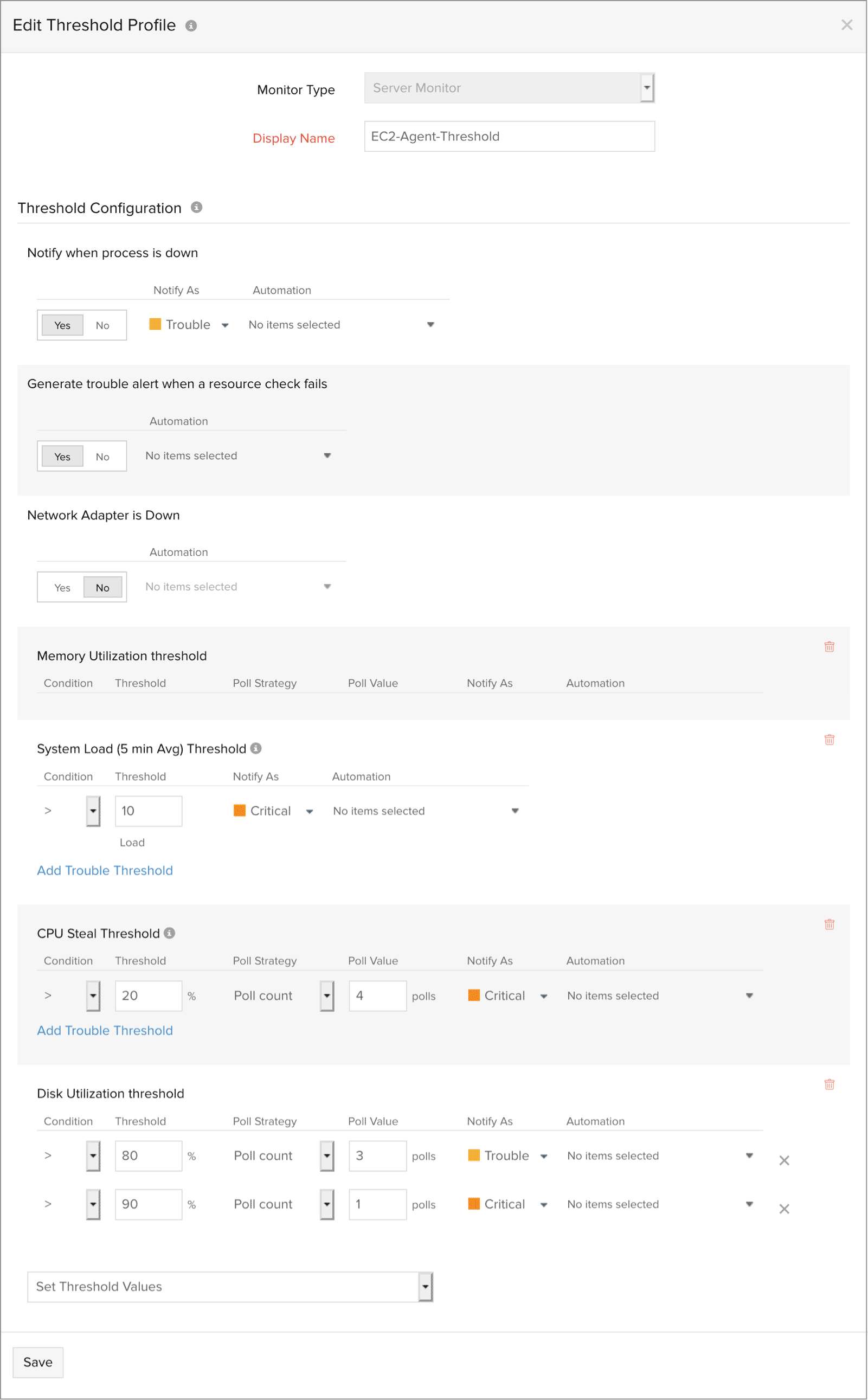 The Threshold Availability profile, will contain the standard EC2 performance counters associated with CloudWatch. Here, you can also configure whether you want to be alerted in the event of agent failure. This notification can either be configured to trouble or down as per your discretion.