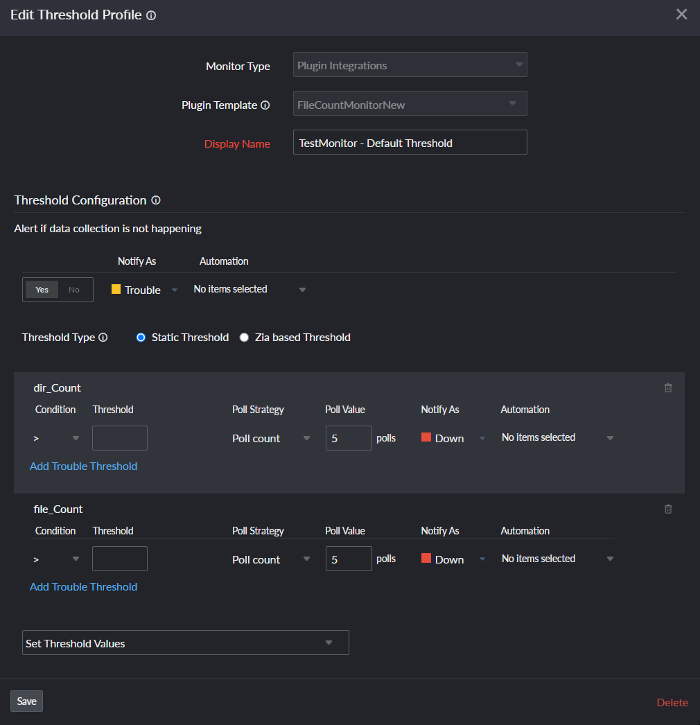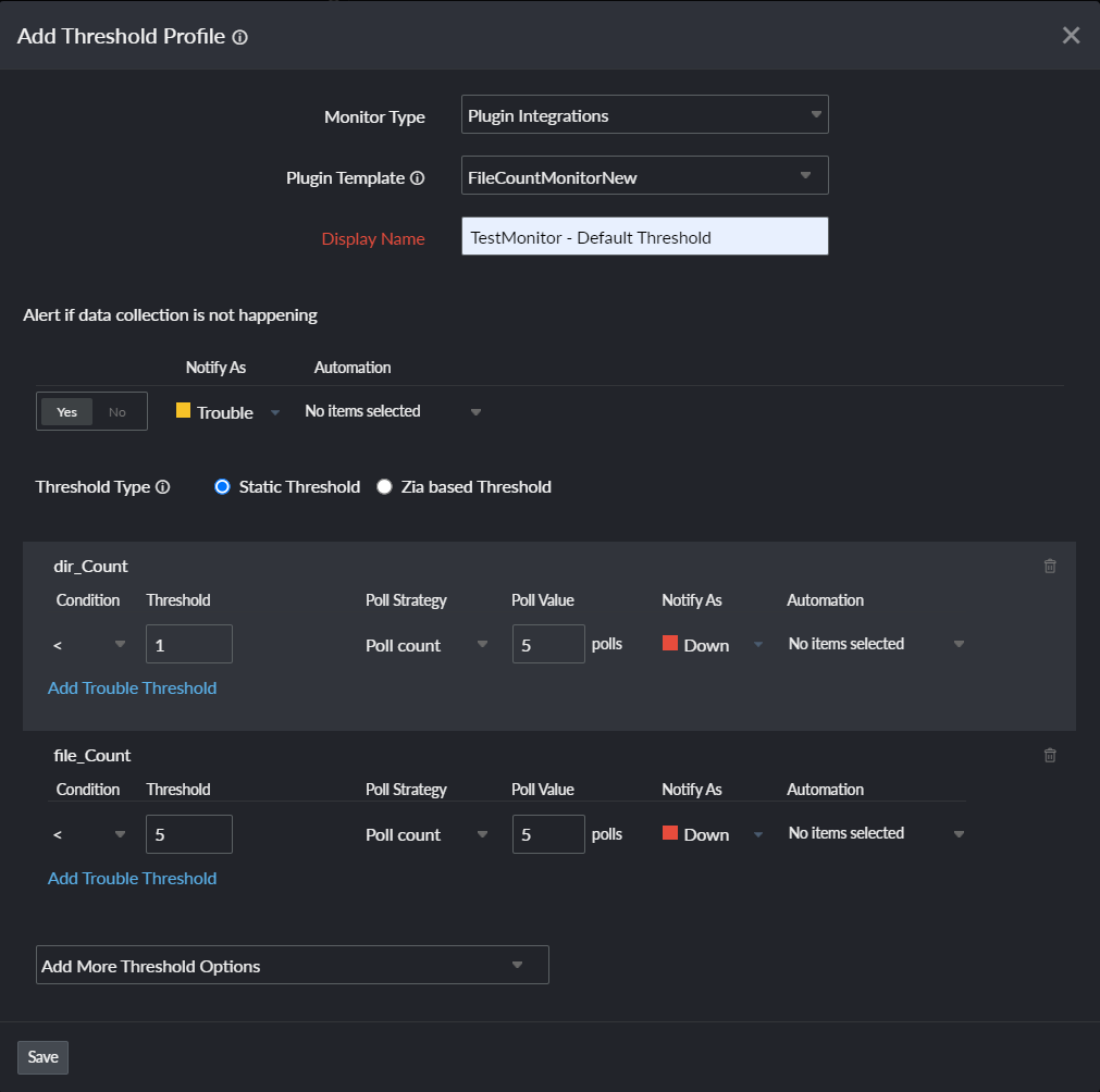 - Alert if data collection is not happening: Select Yes if you want to get alerted when data collection for the respective plugin monitor has stopped. You can opt to get the monitor status as Down, Trouble or Critical.