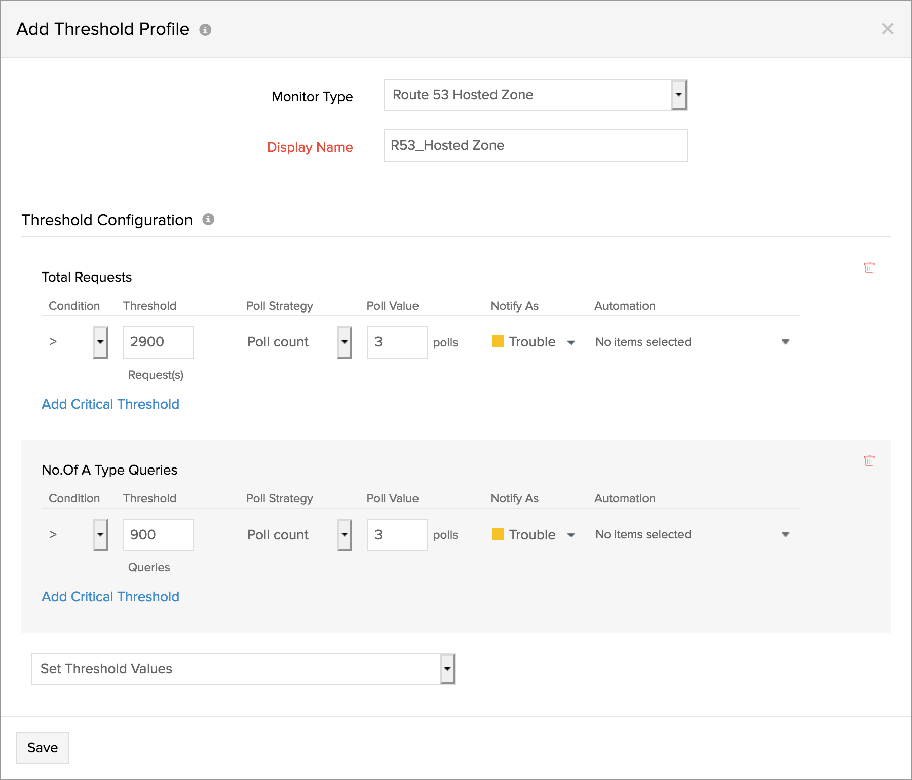 Add a new threshold configuration for Route 53 Hosted Zone monitor.