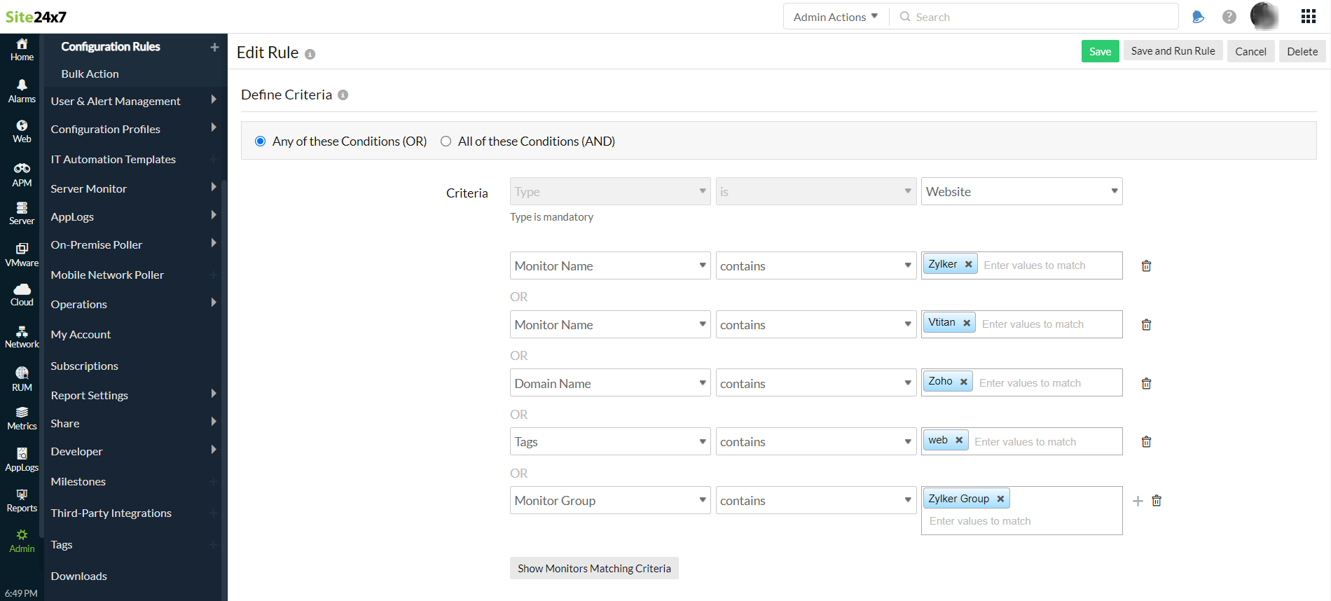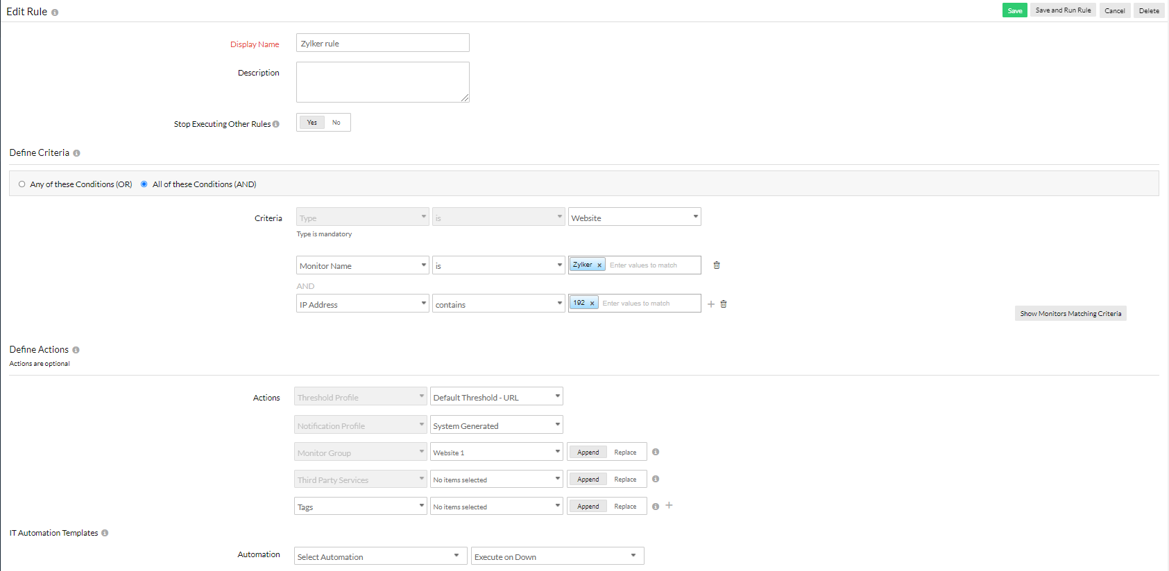 For instance, for monitors containing name "Zylker" or "Vtitan" or domain name "Zoho" or tag "Zylker website" or monitor group "Zylker Group" etc, they will be selected and rule actions will be applied for those set of monitors. If any one of the set criteria matches, then the monitor will be selected and will be considered for applying rule actions.