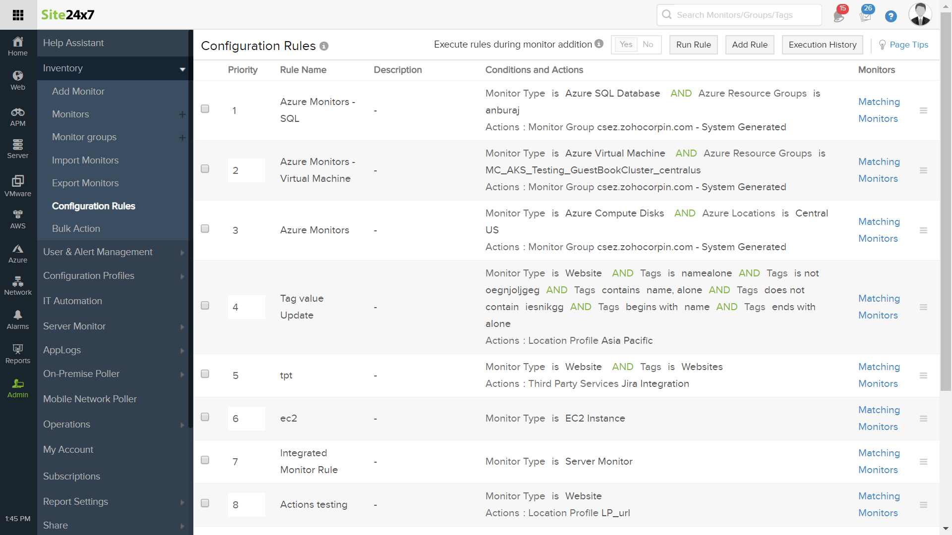 Editing multiple monitors to associate different monitor groups or adding a different tag can be a tedious process. With Site24x7's Configuration Rules, you can automate the configuration settings of your monitoring resources. Also, Site24x7 allows you to create custom rules to continuously track configuration changes and achieve the ideal configuration settings.