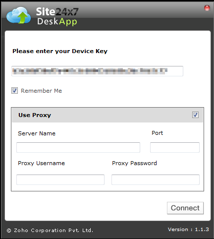 icon on your desktop. - Enter your Device Key and click Connect. You can also enter proxy server settings.