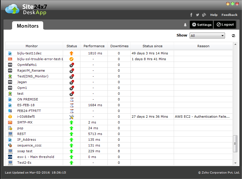 - Find detailed availability status of your configured monitors including their response time and downtime status.