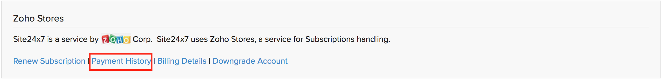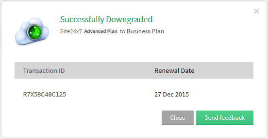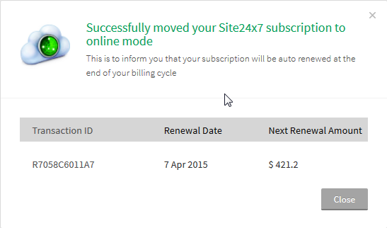 Site24x7 allows you to auto renew your subscription plan at the end of your payment cycle. For offline purchases, you have to contact Site24x7 sales support.
