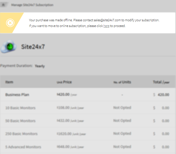 - You will be navigated to the Manage Site24x7 Subscriptions page, where you are provided a notification message to convert to an online subscription mode.