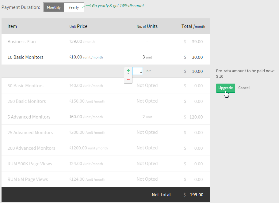 - Enter the required number of units, so as to additionally purchase/deduct basic monitors, advanced monitors or RUM page views. Click Upgrade.