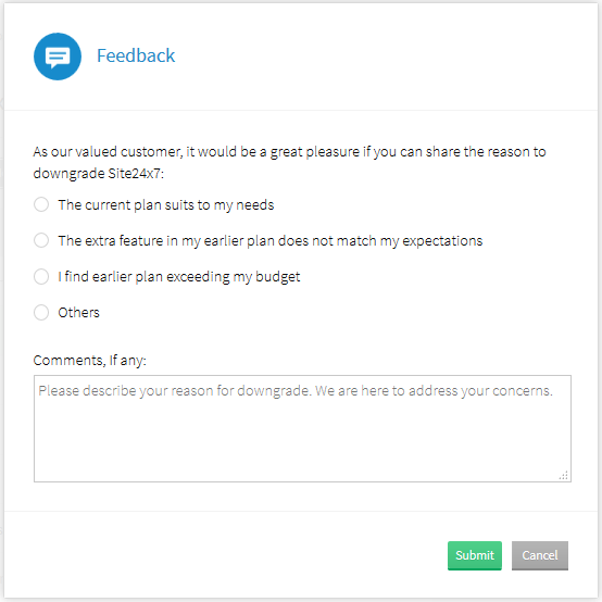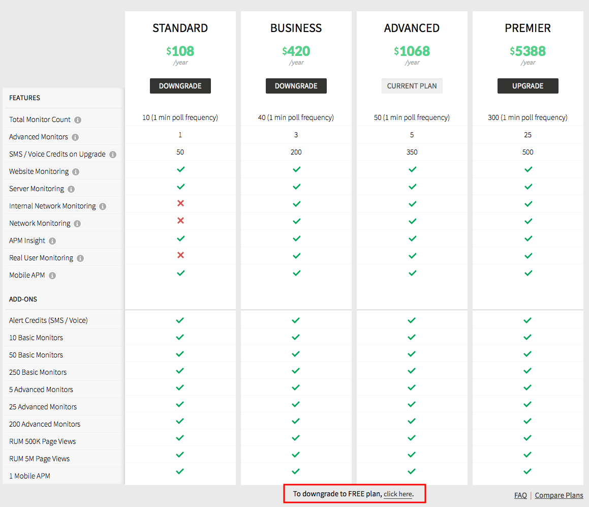 - Click the "downgrade to FREE plan" link given at the bottom of the Site24x7 subscription plan page.