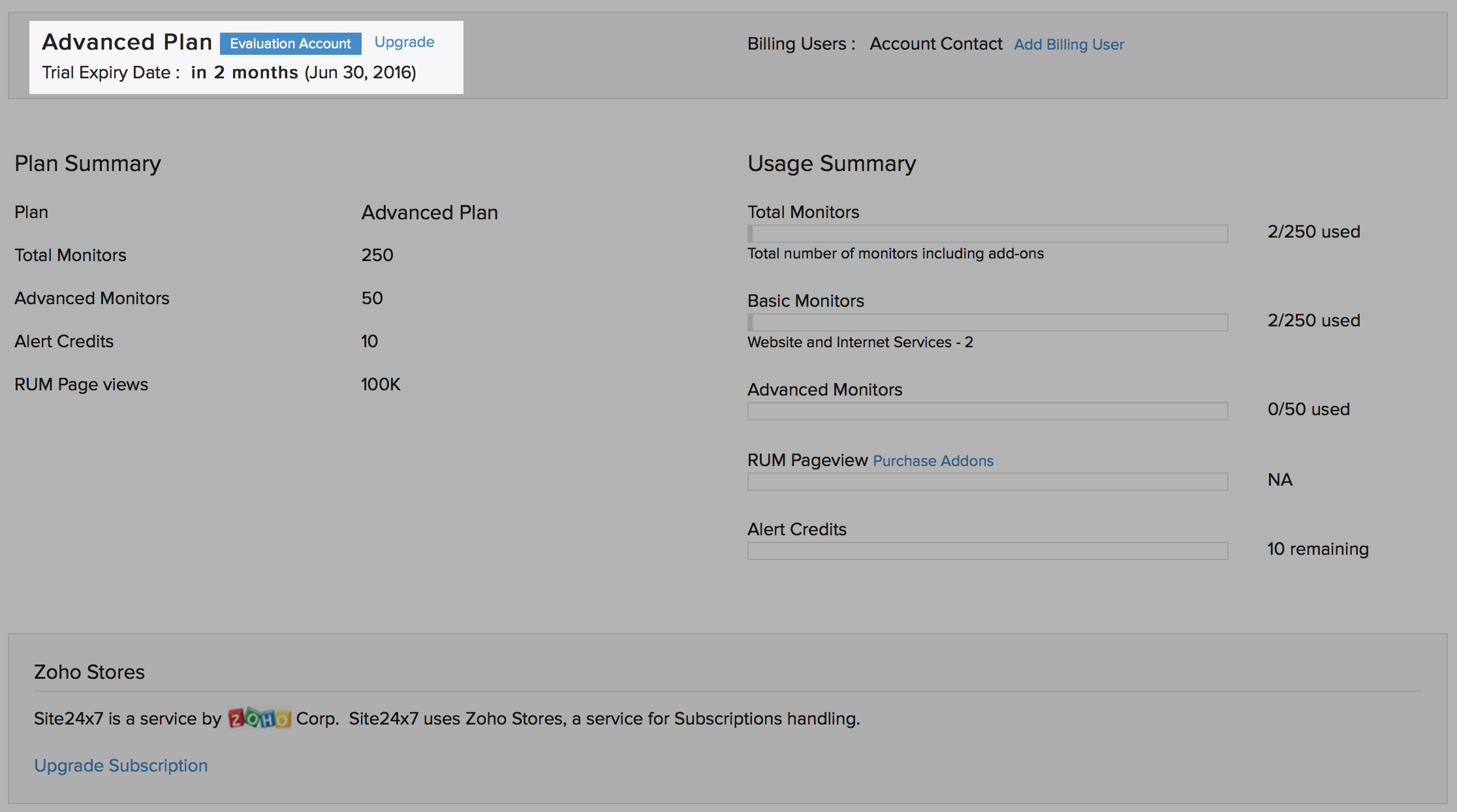 - Advanced Monitors: It provides the total number of advanced monitors you are entitled to use under your current subscription plan. It also includes the add-on monitors count.