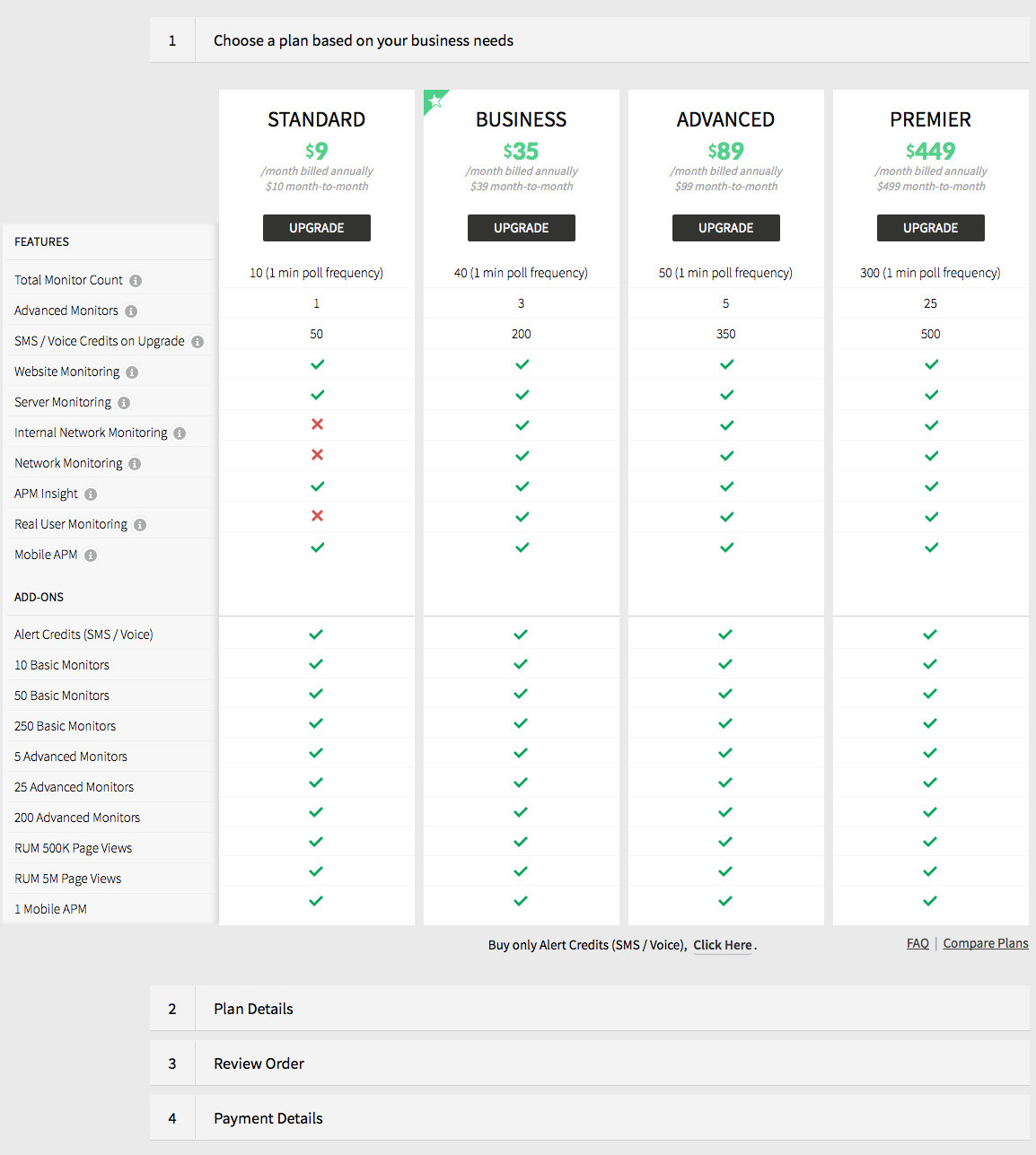 Our subscription model has a concept of basic and advanced monitors. Each subscription package has a set number of basic and advanced monitors. You can choose a specific package based on your business needs and further top-up your pack by purchasing additional add-ons and alert credits. At any given point during your current subscription cycle, you have the freedom to switch over to a different package. We support payment via Credit Card, Paypal and Purchase Order. All payments via Credit Card or PayPal will be auto renewed based on the payment duration opted by you.