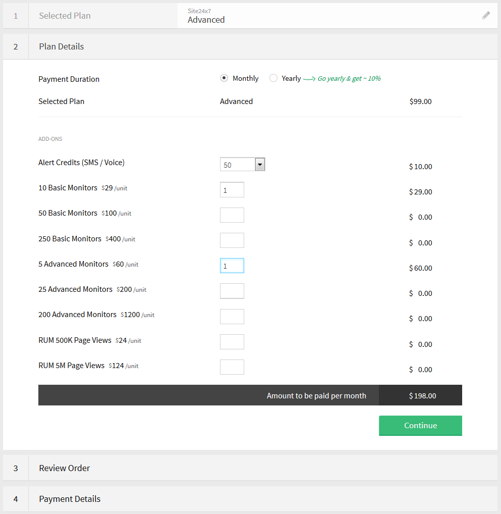 Add-ons are "mini packages" of monitors that can augment your existing subscription. Additionally, they give you the flexibility to add/reduce monitors without moving to a new subscription pack. Site24x7 offers basic monitors, advanced monitors and RUM page views as add-on packages.