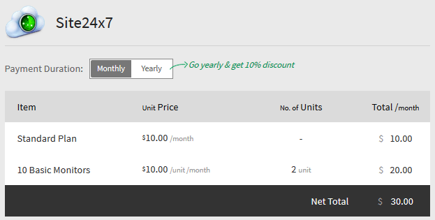 Site24x7 offers a package based pricing model for small IT teams, DevOps to large enterprises. We offer the following packs: Free, Basic, Standard, Business, Advanced, and Premier. There is a 30-days evaluation period and the subscription can be upgraded any time during this evaluation period. The packs will automatically downgrade to FREE account once the evaluation period is completed.