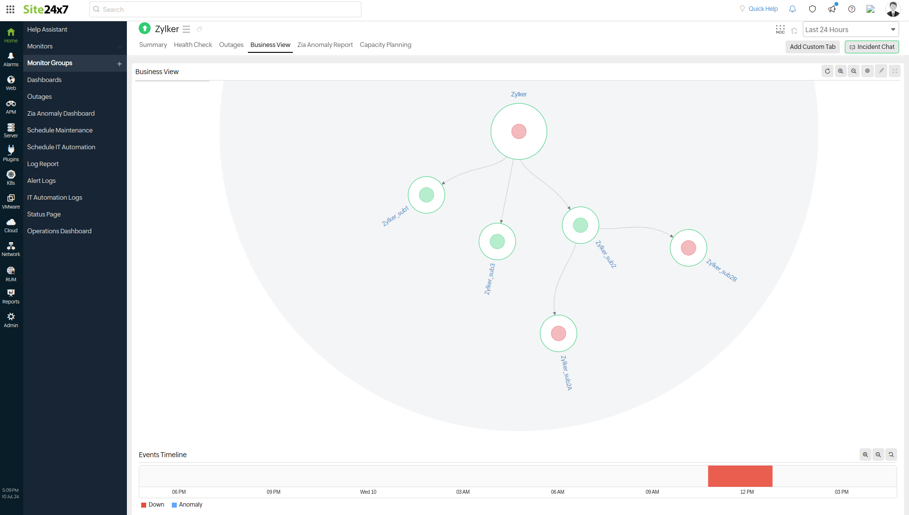 Let's consider a monitor group named Zylker Monitor Group with four monitors: zylker 1, zylker 2, zylker 3, and zylker 4. Say zylker 1 experiences an outage from 9:30am - 1pm.