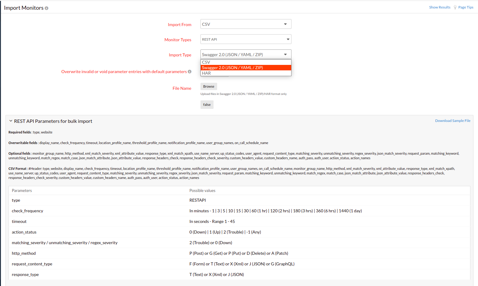 NoteFor REST API Monitor, import the monitor configurations in CSV/JSON or YAML (swagger definition) /HAR formats.The Zip file should contain Swagger 2.0 JSON or YAML files.However, when the REST API monitor is part of the bulk selection, import all monitors via Text/CSV file alone.
