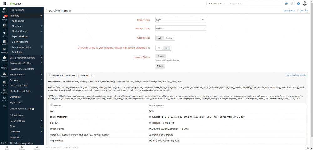 - For bulk importing specific monitor types, there is a list of required parameters at the bottom of the Import Monitors page on the web client. Save and update these parameters in a CSV file with either a .csv or .txt extension, and then upload this file to Site24x7.