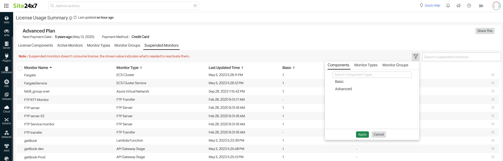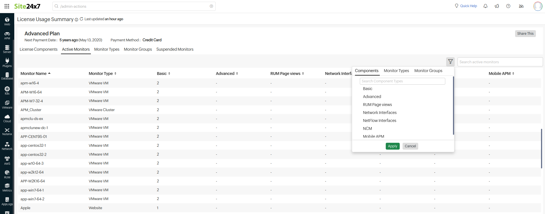 - Active Monitors: Monitor the license consumed by each active monitor in your account, along with the consumption breakdown for each license component. You will be able to view the respective monitor types and their associated license entities. Use the search bar to find a specific monitor quickly, or click the filter icon next to the search bar to filter components based on your preferences.