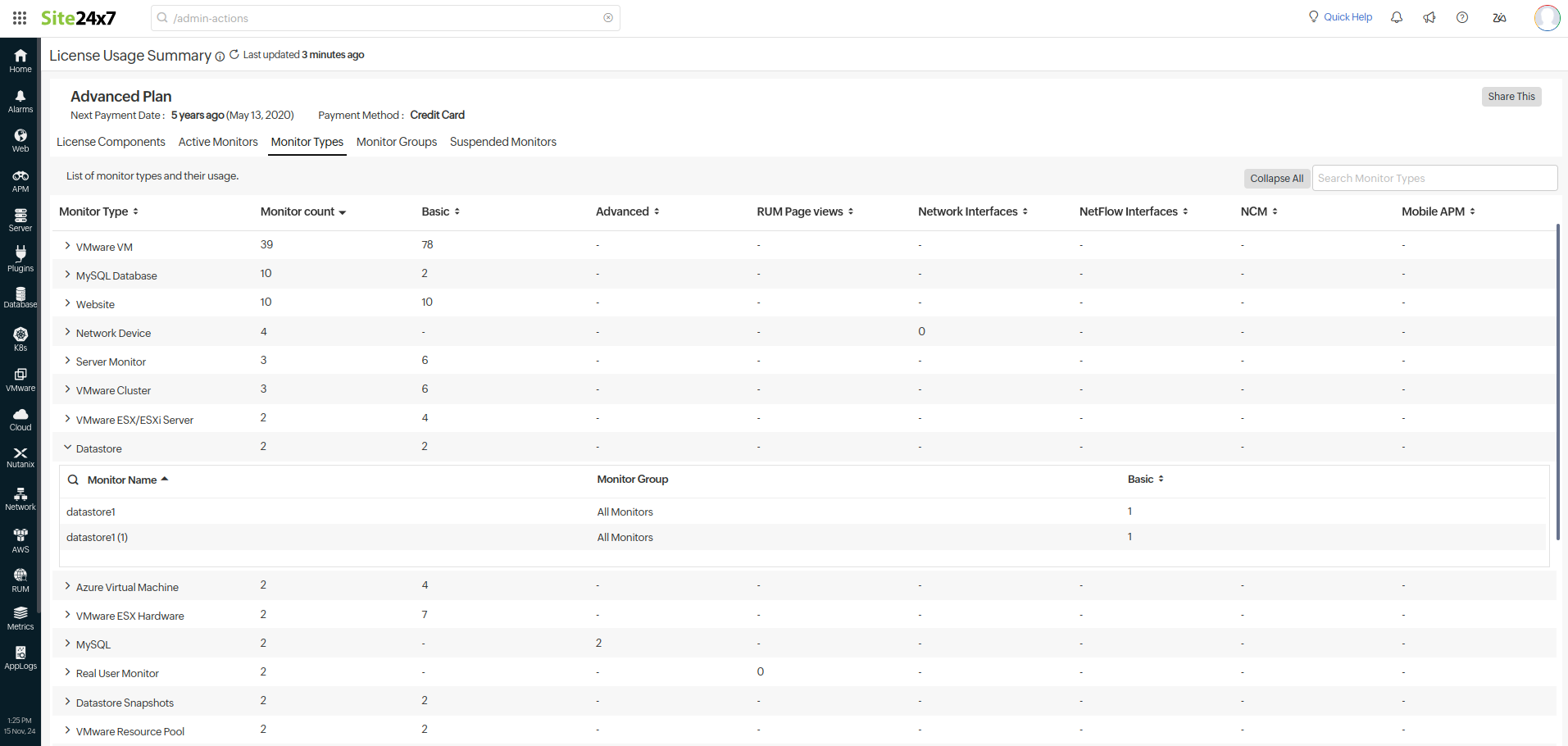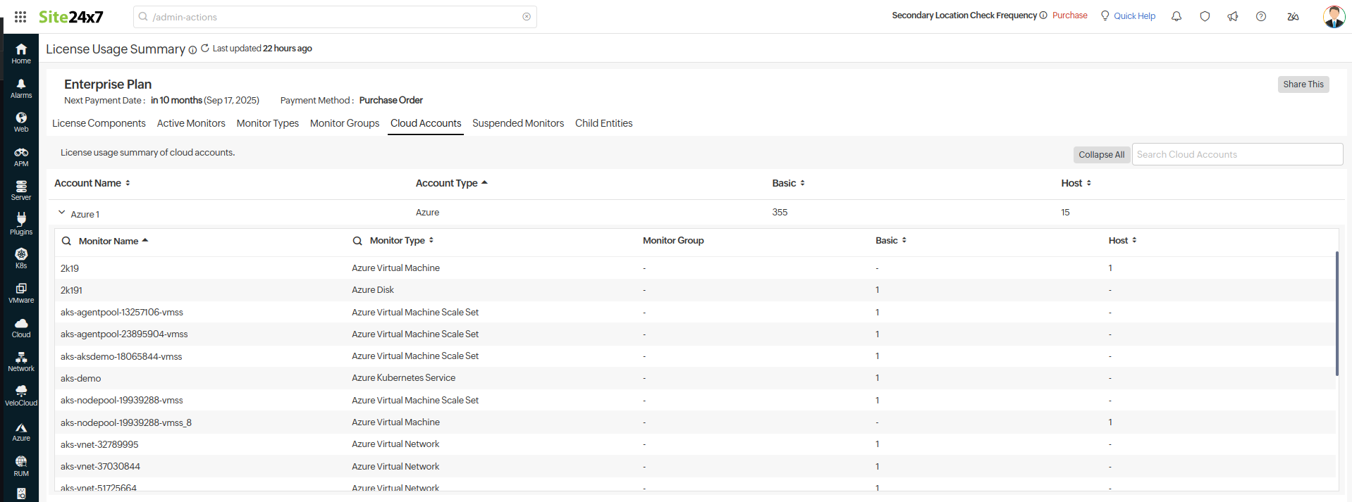 - Monitor Types: View your license consumed by resources based on monitor types, in addition to the monitor count.