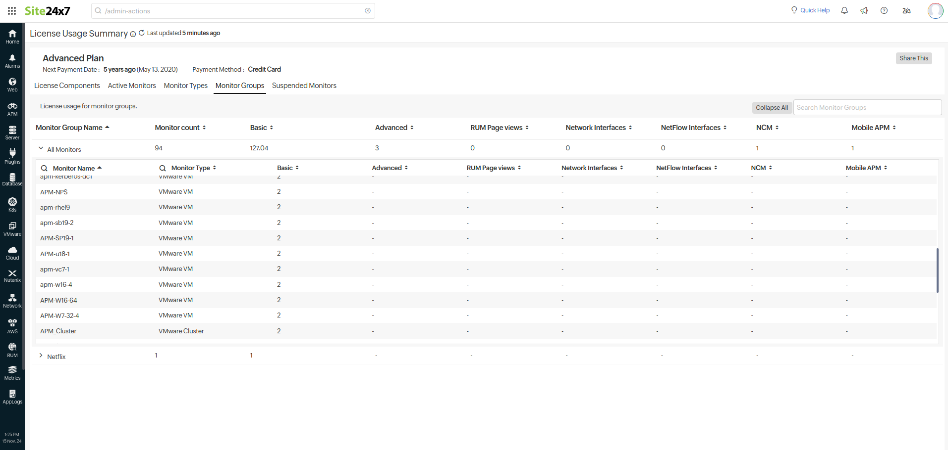 - Monitor Groups: View the license consumption of components organized by monitor groups in your account. You can view the monitor count along with their license entities.