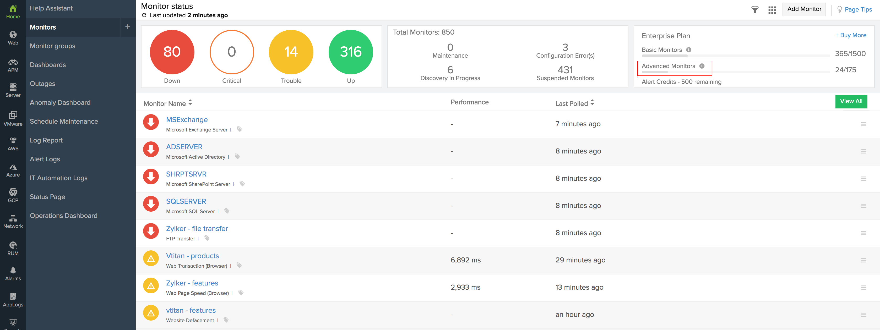 Navigate to Home > Monitors to view the list of all the monitors in your account. At the top right corner you will see the number of basic and advanced monitors in your account as shown in the image below: