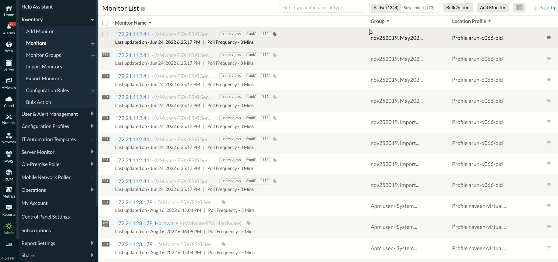 - Login to Site24x7 and navigate to Admin > Inventory > Monitors.