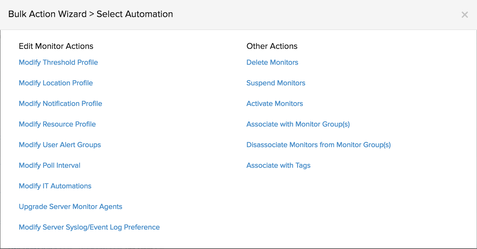 - Choose the required monitors and select the desired bulk action in the Bulk Action Wizard > Select Action screen.